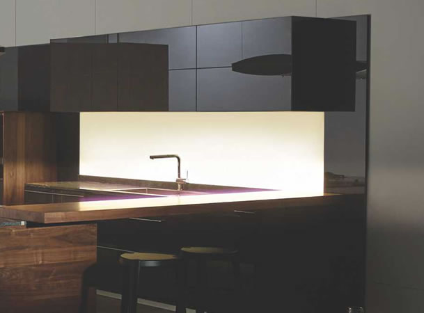 A striking light panel sheds homogenous glow across the open-plan layout that remains connected through glass panelling and a breakfast counter while offering minutely planned space identity. The floating chimney offers a visual anchor to the symphony of steel, walnut and granite.