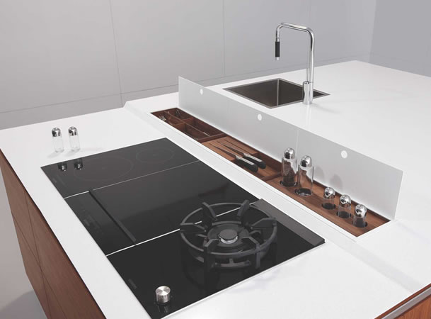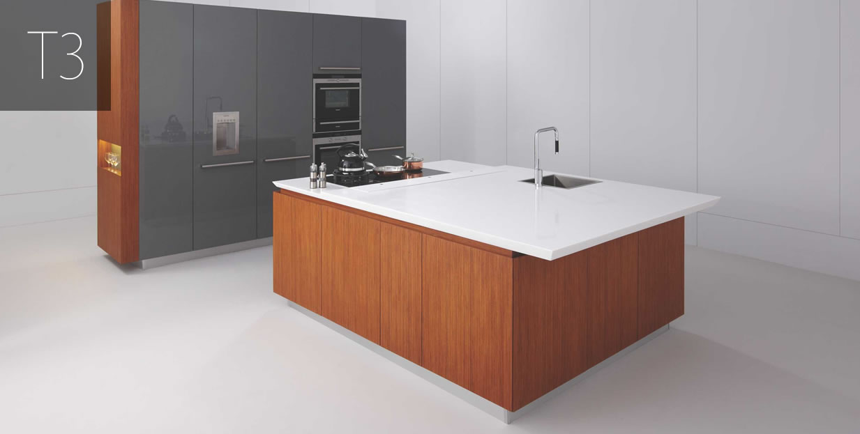 At the heart of T3 is a large centre island made from reconstituted veneer and lacquer, with a prep sink and seating area. The floating, 60mm thick, corian counter top with bevelled edges cleverly echoes the design language of its puristic fronts, even as its different levels distinguish the working spaces. The all encompassing design – and plenty of space – means you need no other storage options.